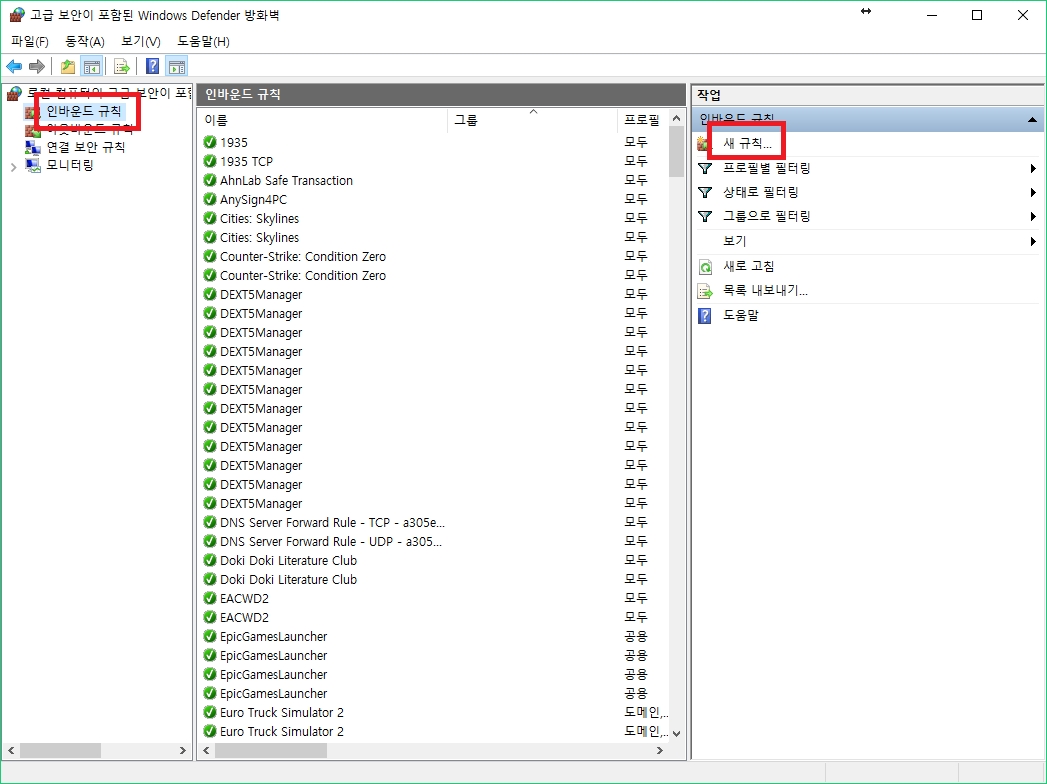 좌측 인바운드 규칙을 누른 후 우측에 새 규칙 버튼을 눌러줍니다.