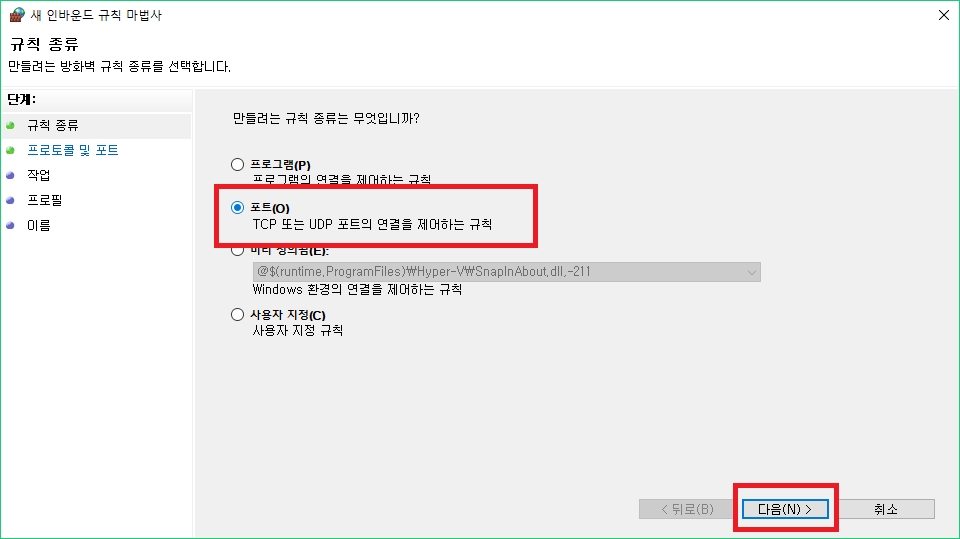 https://s3.amazonaws.com/helpscout.net/docs/assets/5a26cd182c7d3a1a640c9a5d/images/5a65e4402c7d3a39e626380b/file-DCttiiL8aq.png 포트를 선택하고 다음 버튼을 눌러줍니다.